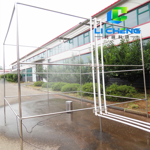 噴霧單元由供水管路、直管段、噴嘴、支架等組成,噴嘴采用世界上專業(yè)生產(chǎn)模擬雨滴噴頭的美國SPAYING SYSTEMS公司生產(chǎn)的FULLJET旋轉(zhuǎn)下噴式噴嘴,不銹鋼材質(zhì),噴嘴和直管段集成在一起,噴霧支架為不銹鋼方管結(jié)構(gòu),用來架設(shè)供水管路和噴嘴。
